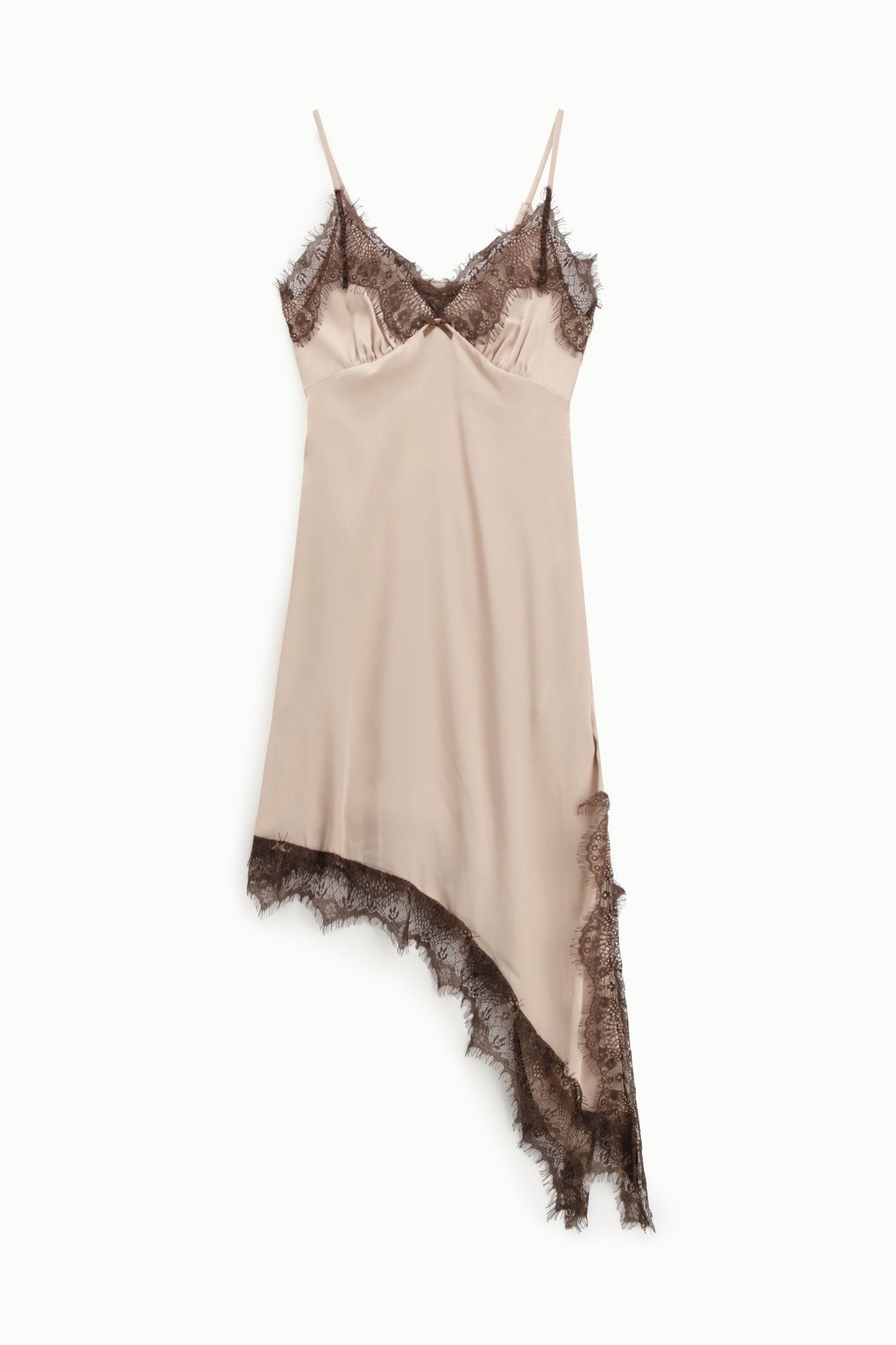 Un abito corto che gioca con lasimmetria del fondo e dettagli in pizzo a contrasto su scollo e orlo. Le spalline sottili esaltano la linea delle spalle, mentre la vestibilità fluida lo rende ideale anche sopra un blazer per le uscite in città. Lavorazione attenta ai dettagli, perfetta per sentirsi speciale ogni giorno.