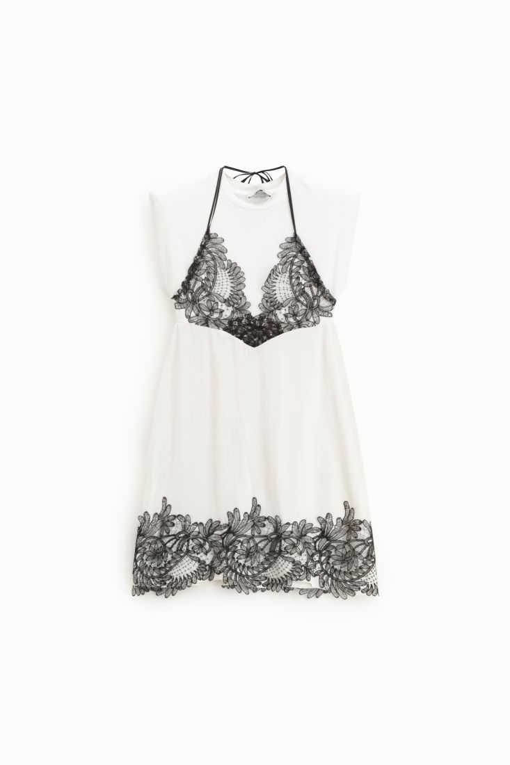 Linee semplici ma ricche di personalità: questo abito corto senza maniche cattura lo sguardo grazie agli inserti in pizzo che disegnano il décolleté e il bordo inferiore. Vestibilità comoda per una giornata dinamica e sempre attenta ai dettagli, perfetto da indossare con stivali per uno stile deciso ma delicato.