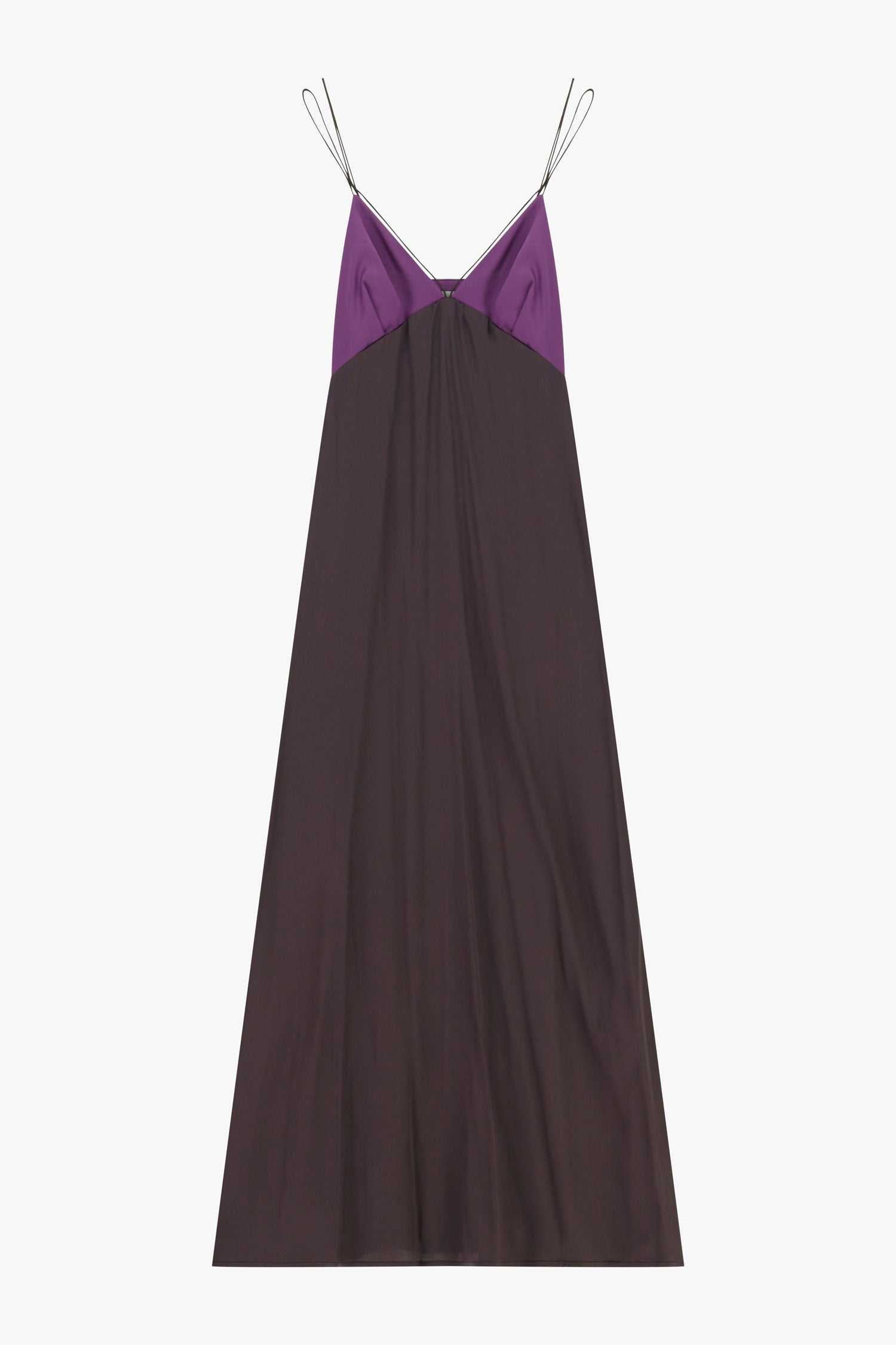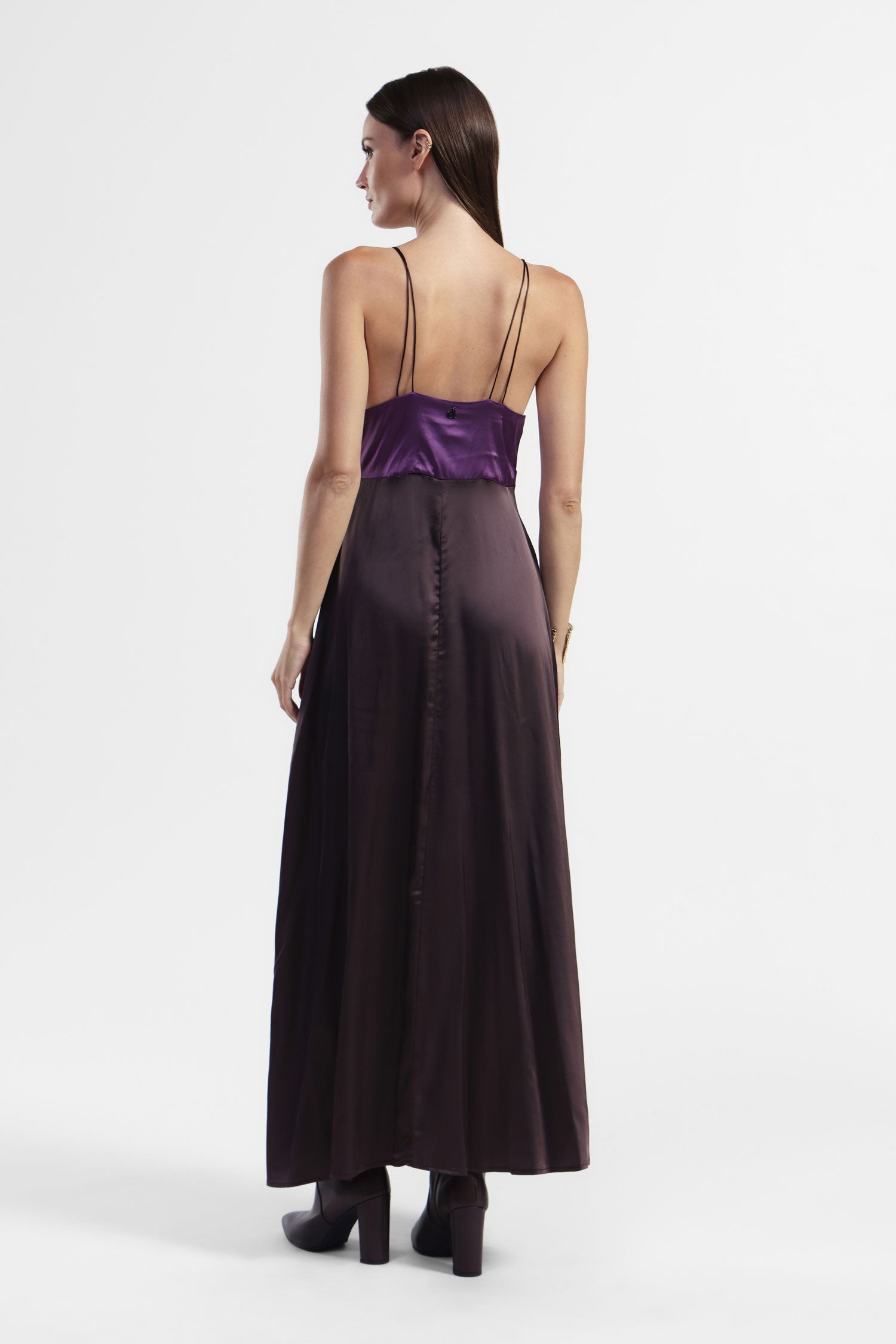 Sperimenta la bellezza di questo abito lungo con spalline sottili e scollo a v. Il design a blocchi di colore aggiunge un tocco di originalità, perfetto per un look elegante e sofisticato. Ideale per occasioni speciali, ti farà sentire unica e affascinante.