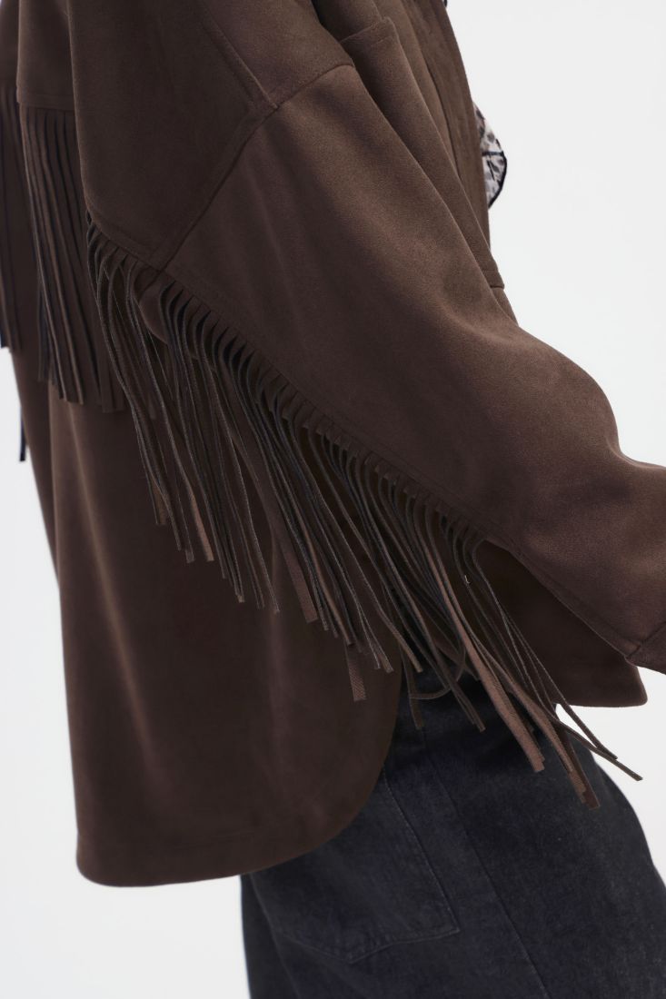 Dona un tocco speciale al tuo look quotidiano con questo blazer dalle linee morbide e arricchito da dettagli con frange. La chiusura a bottoni offre una vestibilità comoda e versatile, ideale per abbinamenti casual o più eleganti. Indossalo sopra un top o una camicia per un effetto chic e ricercato.