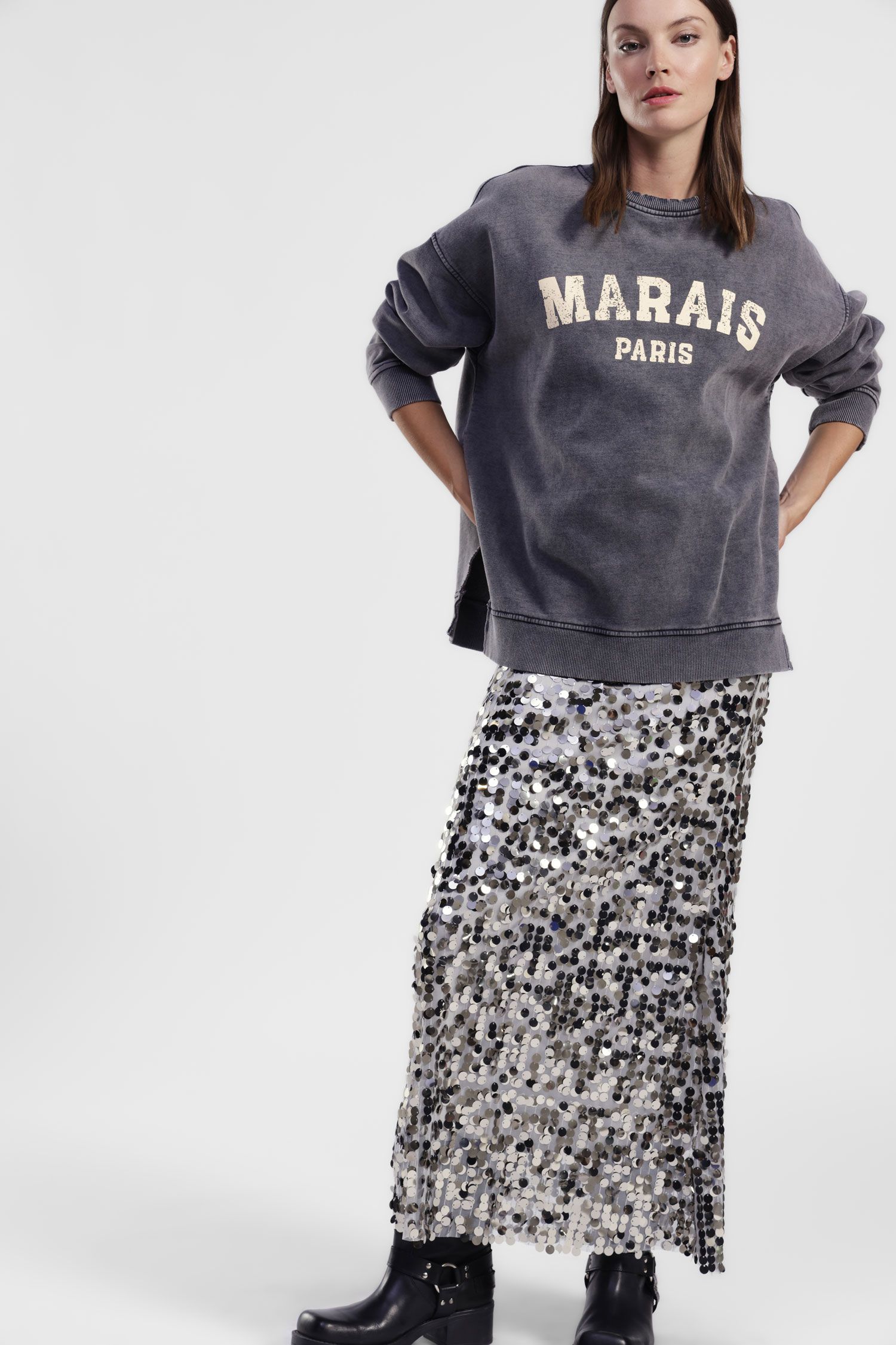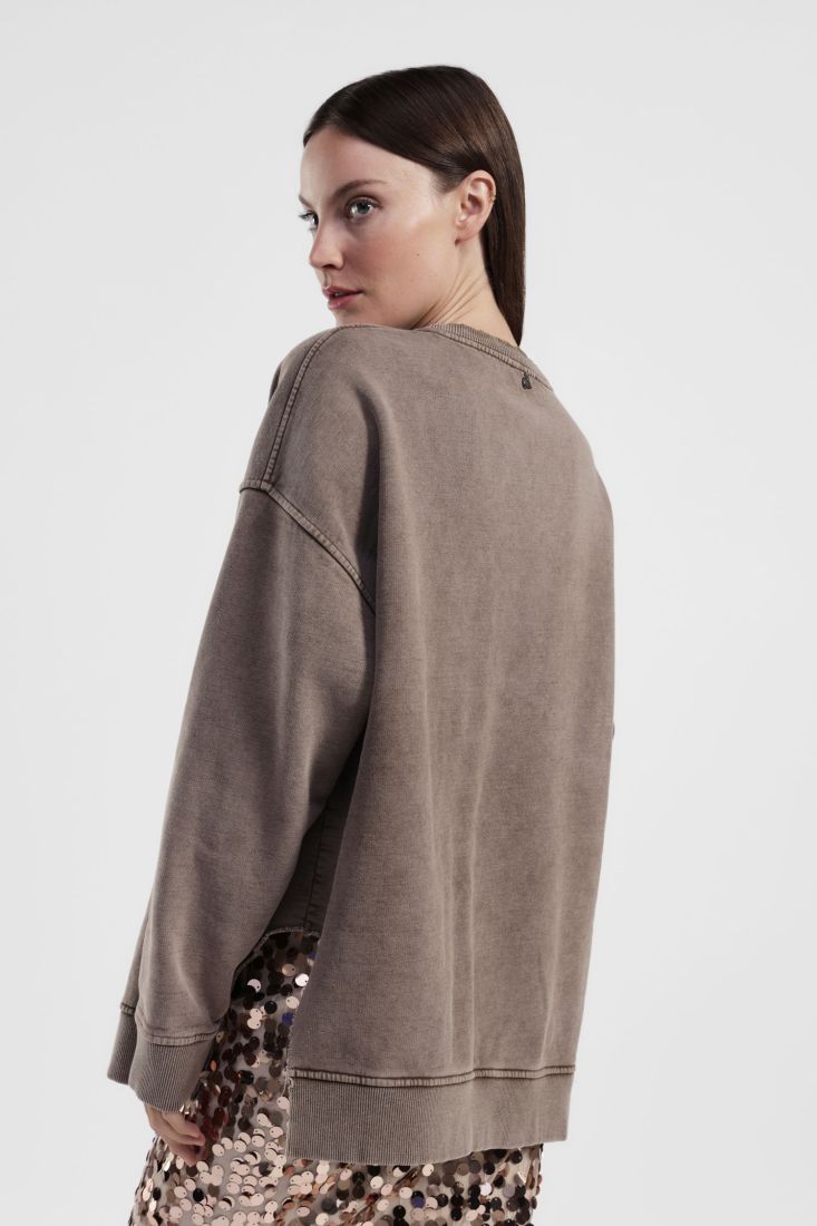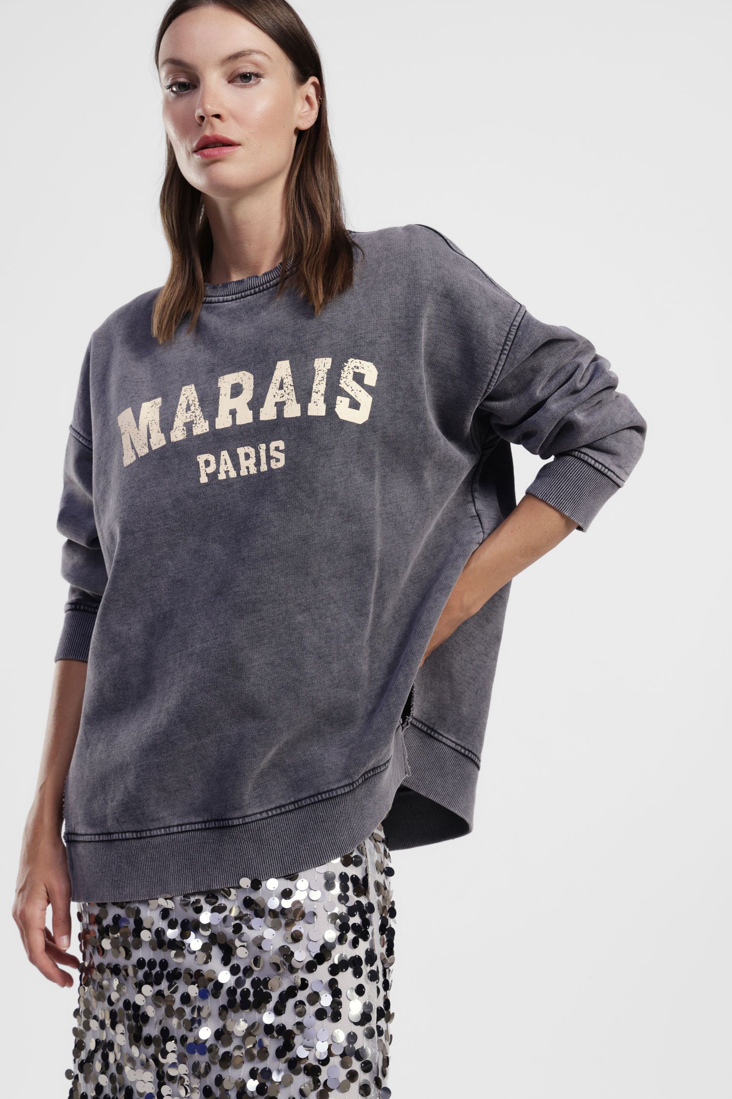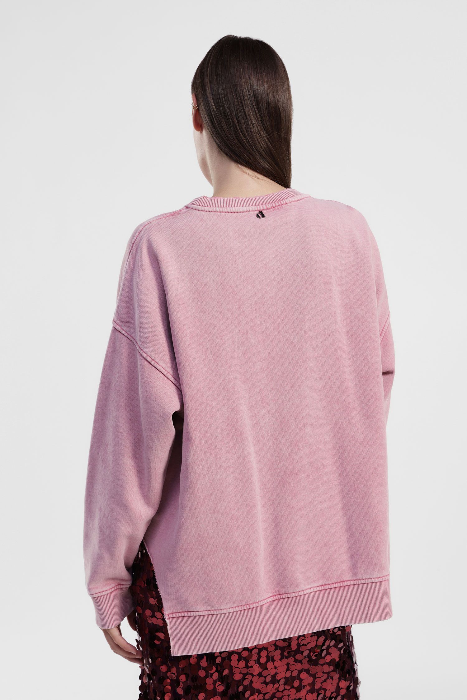 Una felpa dal taglio rilassato con stampa sul davanti, perfetta per chi ama distinguersi con stile ogni giorno. Il fit ampio dona comfort e libertà di movimento, mentre il collo rotondo e i polsini a costine aggiungono un tocco curato. Da indossare con gonne o pantaloni, ideale per dare carattere anche ai look più semplici.