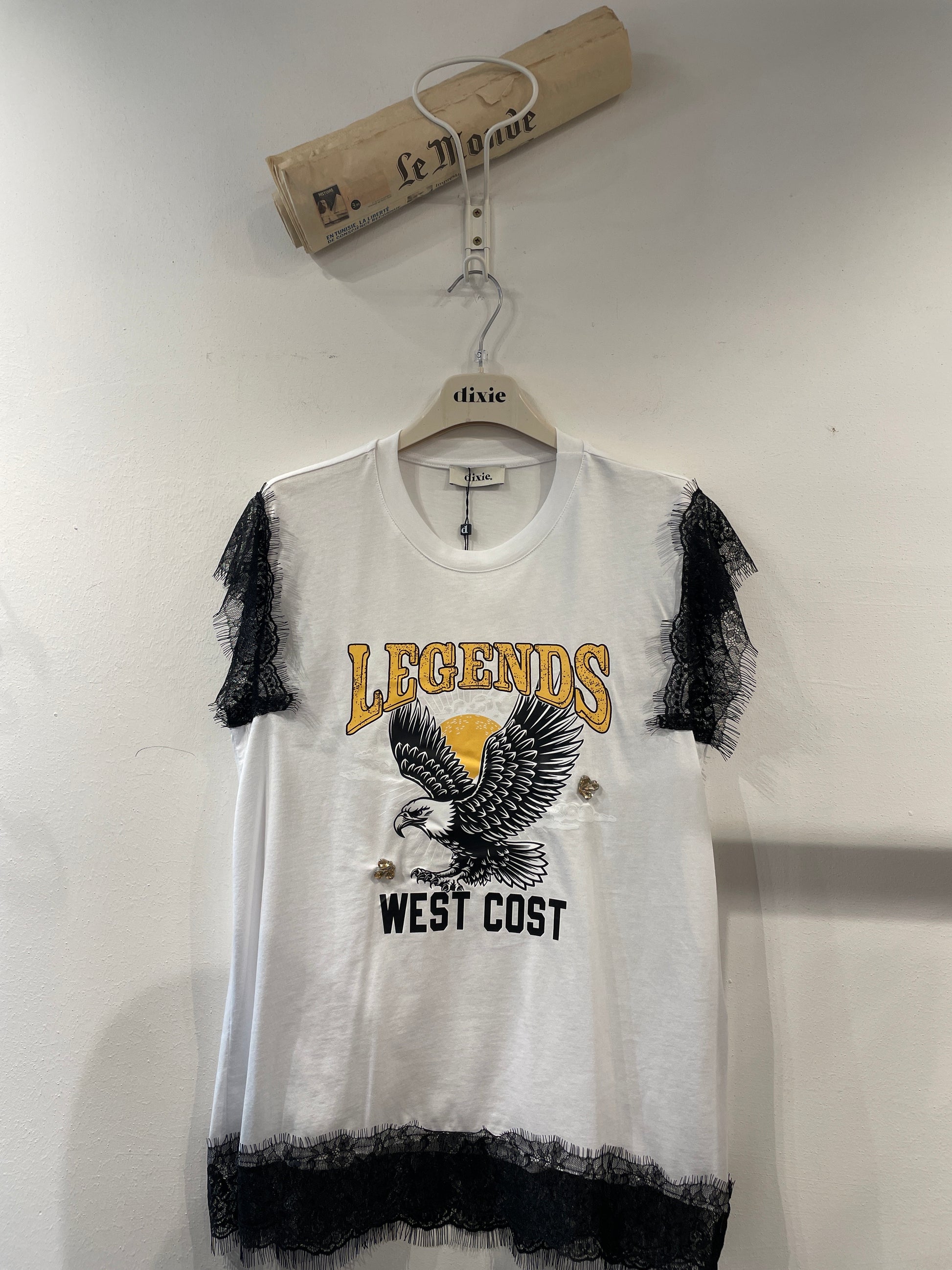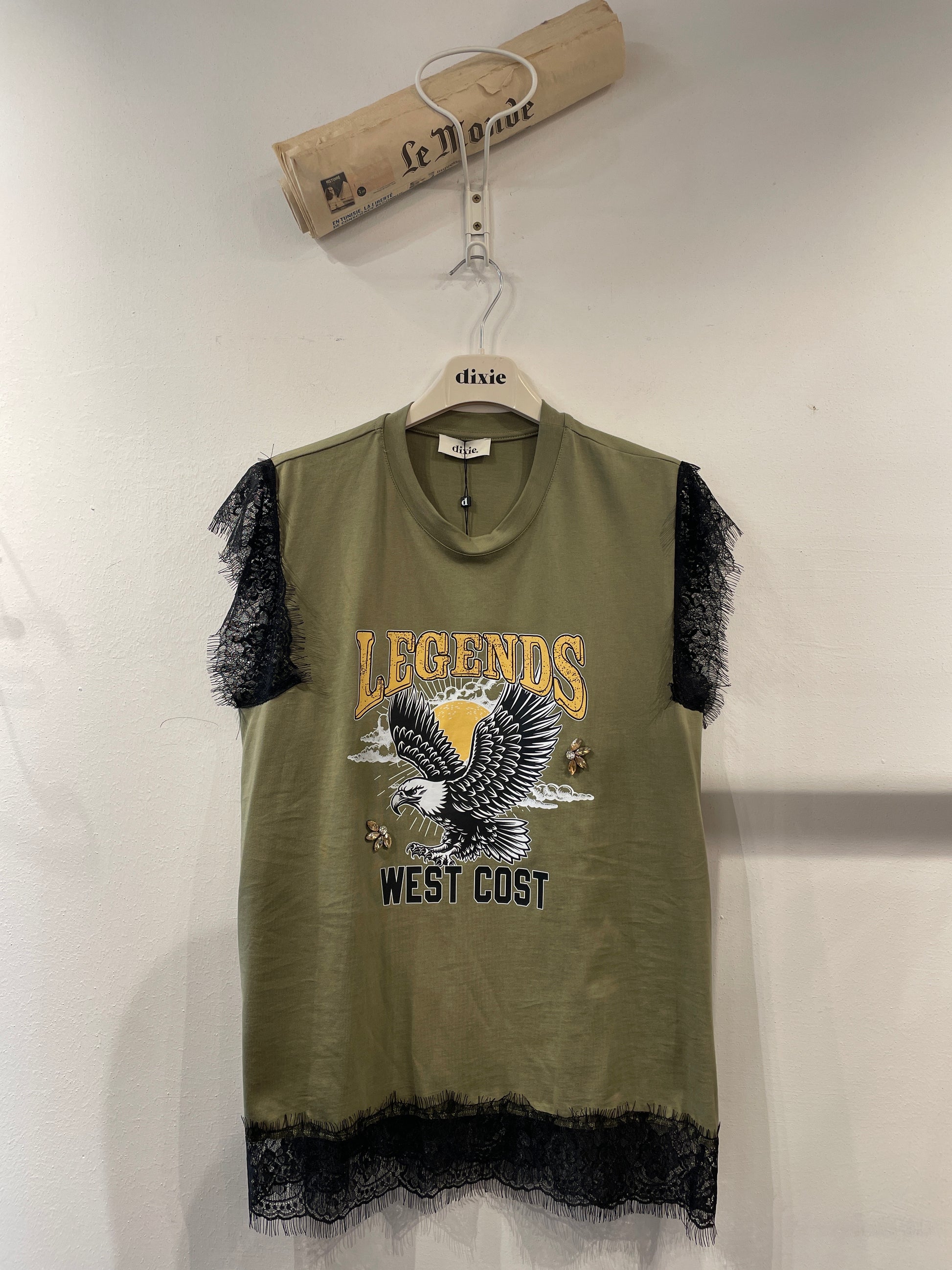Un top girocollo con stampa grafica ispirata al tema west coast, perfetto per aggiungere un tocco originale e grintoso al tuo look quotidiano. I dettagli in pizzo sulle spalle e sul fondo regalano un accento romantico e femminile. Pensato per chi ama distinguersi, si abbina facilmente a pantaloni relaxed o gonne svolazzanti.
