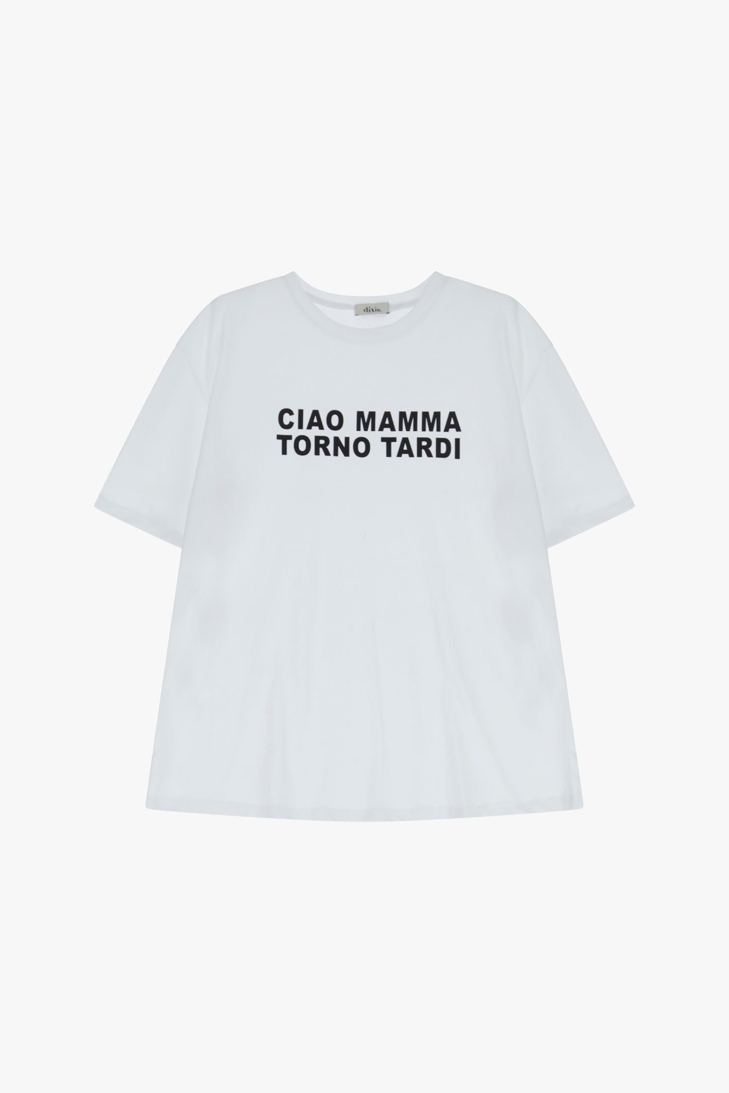 T-shirt morbida a maniche corte con stampa frontale 'ciao mamma torno tardi'. Vestibilità confortevole e taglio dritto, perfetta per dare un tocco ironico e originale ai tuoi look quotidiani. Facile da abbinare a jeans, gonne o pantaloni per momenti di libertà e spensieratezza.